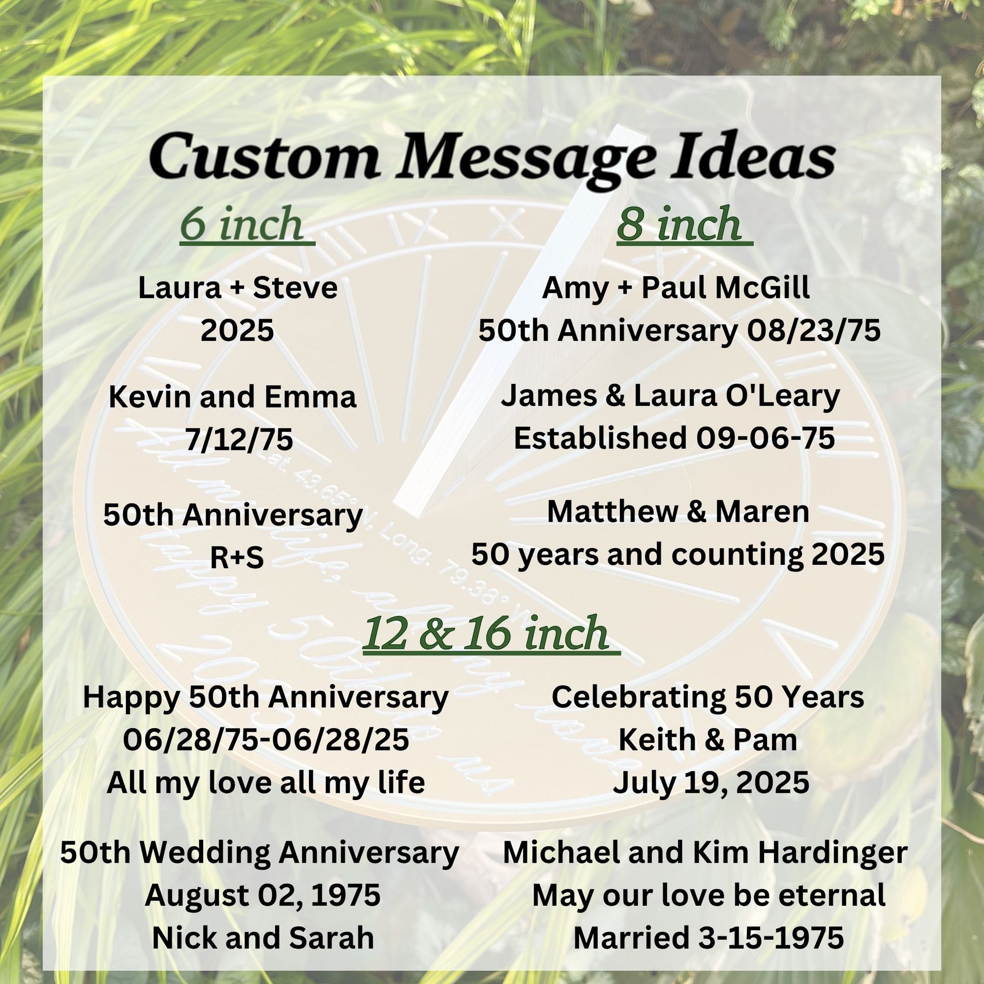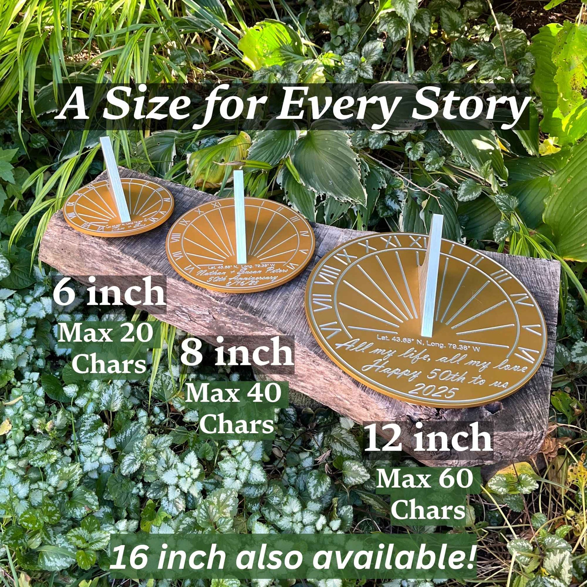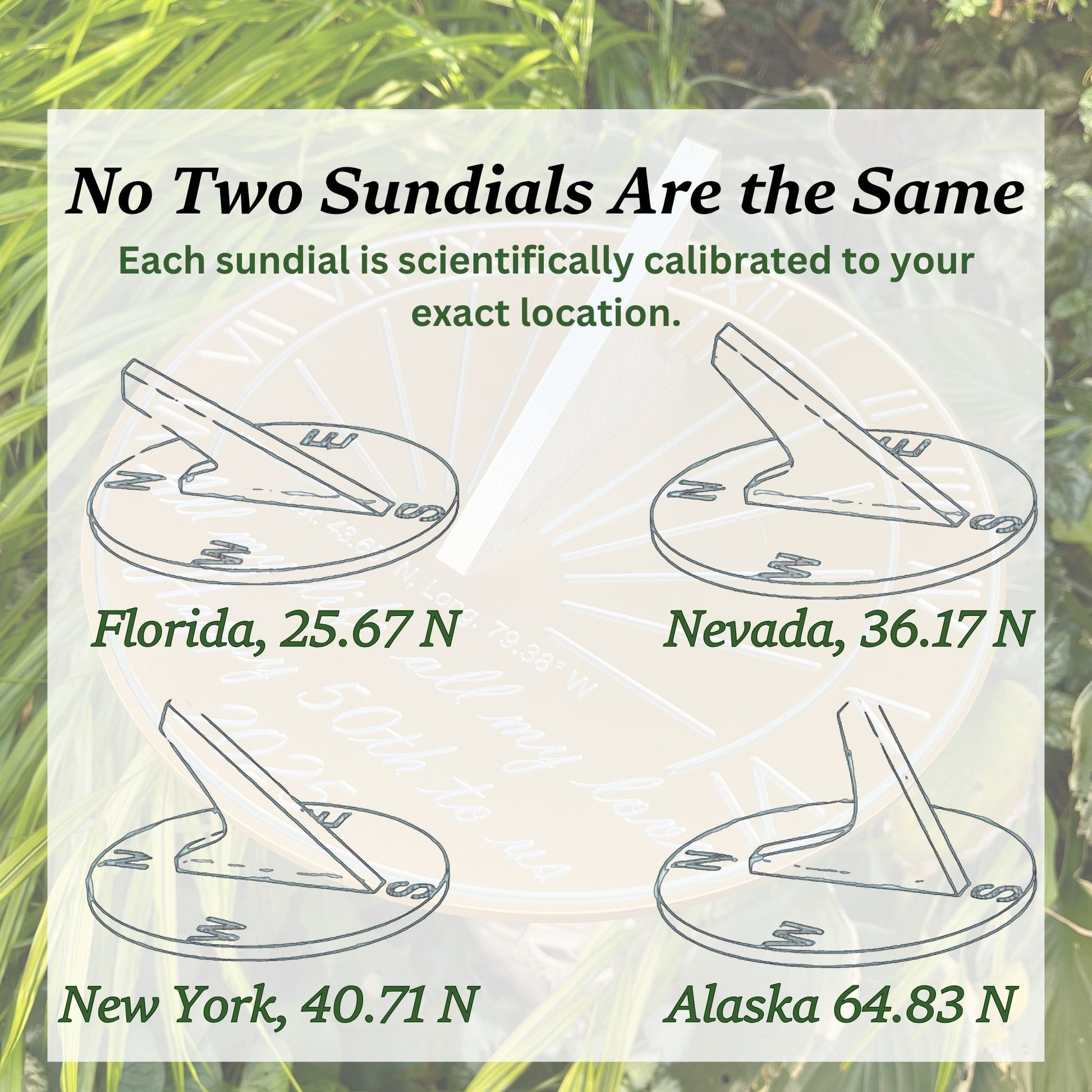 Why is every 50th anniversary gold gifts sundial made to your location? We strive for precision and elegant design. Just like every single place on the planet is different, so is every one of our sundials. A sundial is made of two components, the dial and the pointer (gnomon). The pointer casts a shadow on the dial, allowing you to tell the time. However, the sun's rays hit the Earth at different angles depending on where you live! Whether you live in Florida where the sun is high in the sky or further north in New York where the sun is lower, a different size pointer and dial design is required. Our pictures above illustrate the visibly different angles that are required. Description: Circular sundial, made of aluminum and stainless steel, custom made for your location, includes custom engraving at no extra cost.